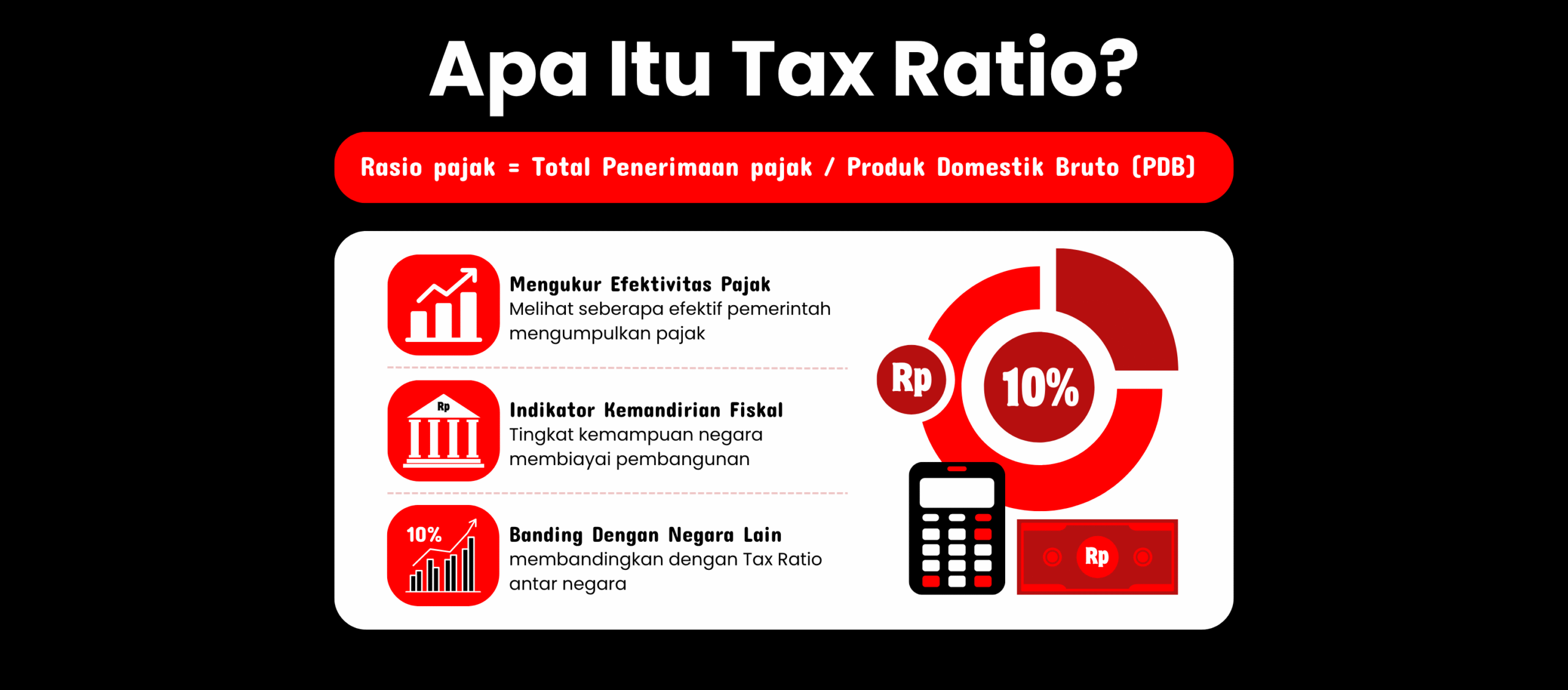 Dalam bukunya Perpajakan Edisi Terbaru, Mardiasmo (2018) menjelaskan bahwa tax ratio adalah perbandingan antara total penerimaan pajak dengan PDB dalam satu tahun. Artinya, rasio ini jadi cermin kemampuan pemerintah dalam menarik pajak dari kegiatan ekonomi masyarakat.
